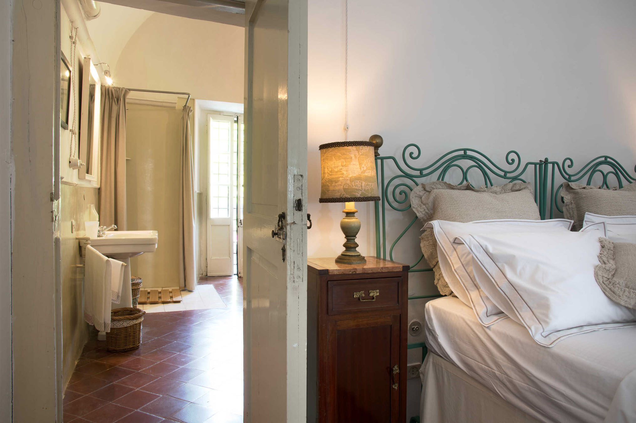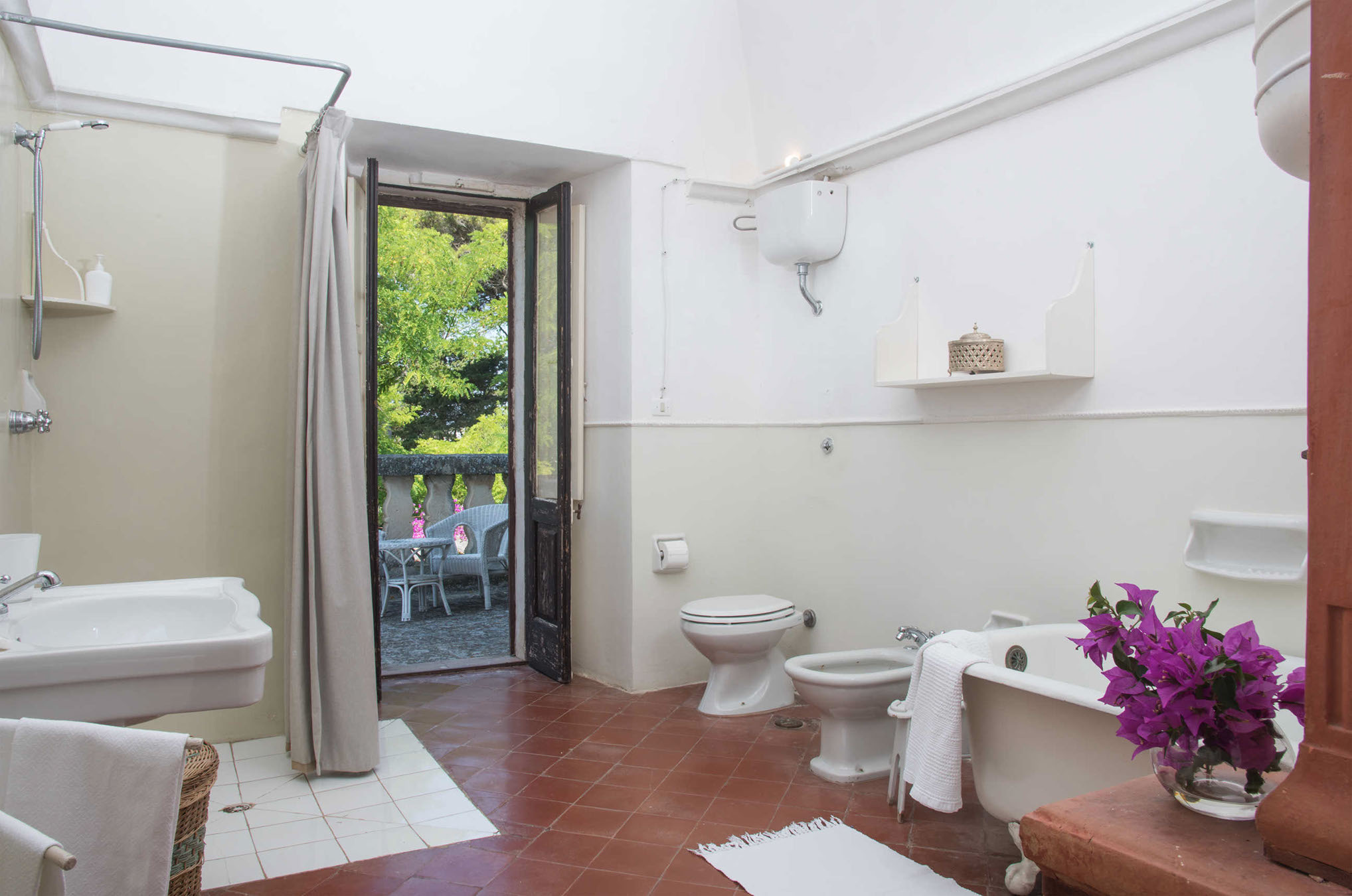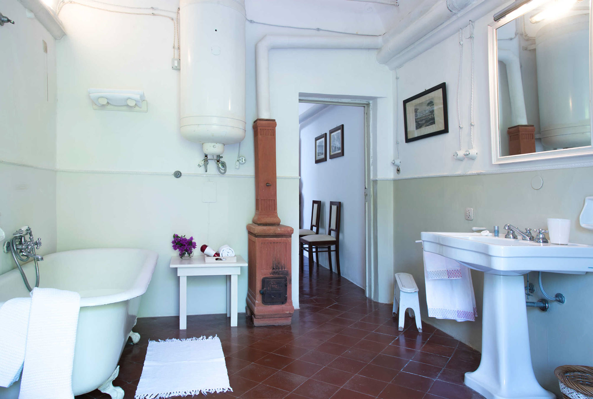 The SUITE PADRONALE (MASTER SUITE), this suite is located on the first main floor and has a private terrace overlooking the park. The suite consists of a large double bedroom with the possibility of access to a second bathroom and a small twin room located on a higher level. The large bathroom has a beautiful antique bathtub and shower.